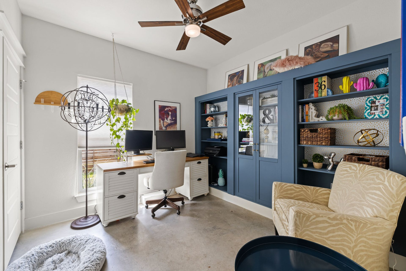 Custom cabinetry was designed for first floor office and a full bath is located across the hall from first floor bedrooms.